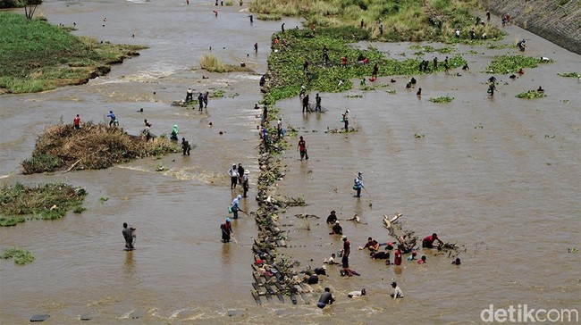 Sukoharjo - Saluran air di bendungan atau Dam Colo, Sukoharjo, Jawa Tengah, mulai ditutup hari ini. Warga pun tumpah ruah terjun ke sungai untuk berlomba-lomba mencari ikan
