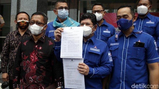Jakarta - Partai Demokrat bersama kuasa hukum datangi kantor Kemenkumham. Mereka datang untuk menyerahkan bukti terkait pengajuan uji materi AD/ART kubu Moeldoko.