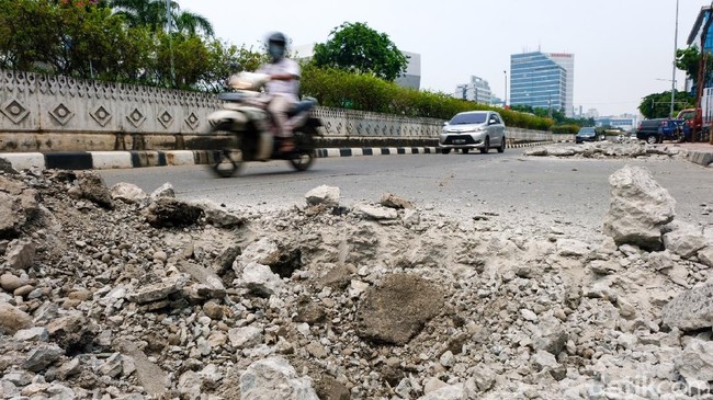Jakarta - Proyek galian dikerjakan di Jalan Angkasa, Kemayoran, Jakarta. Proyek itu diketahui merupakan proyek sumur resapan untuk cegah genangan saat musim hujan.
