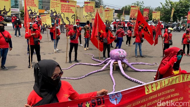 Karawang - Ratusan buruh gelar aksi di depan kantor Pemkab Karawang. Ada sejumlah tuntutan yang disuarakan buruh dalam aksi itu, salah satunya mendesak Omnibus Law dicabut