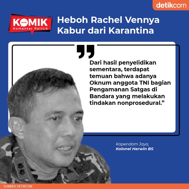 Awalnya, kaburnya Rachel dari karantina ini diungkap Kapendam Jaya Kolonel Herwin BS. Rachel Vennya diduga dibantu oleh oknum TNI untuk kabur.