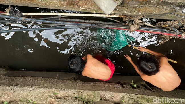 Nekat, Anak-anak Cari Ikan di Selokan Penuh Kabel Optik