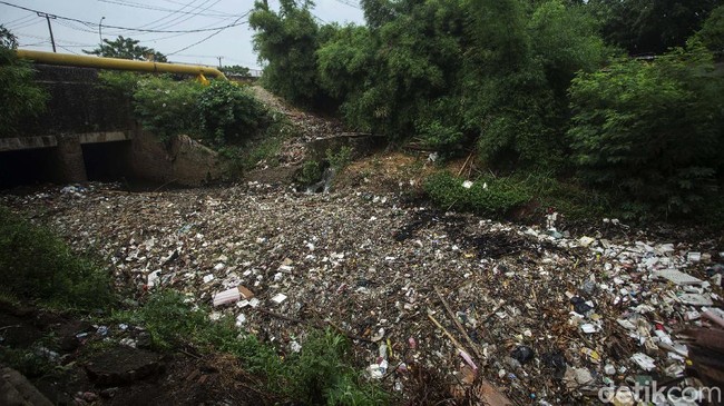 Jakarta - Sampah rumah tangga menutupi aliran kali di Jatimulya, Tambun, Kabupaten Bekasi, Senin (18/10/2021). Begini penampakannya.