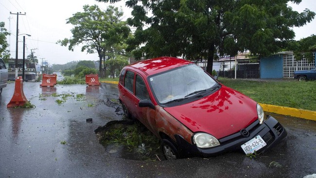 Penampakan sebuah mobil yang bagian depannya tampak tersangkut di lubang jalan akibat Badai Rick yang menghantam kawasan Lazaro Cardenas, Meksiko, Senin (25/10/2021) waktu setempat.