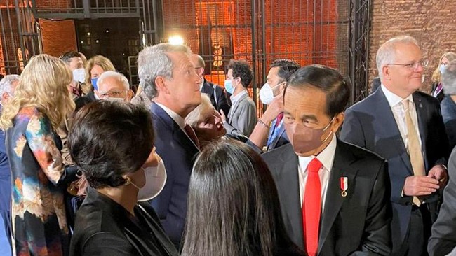 Jakarta - Presiden Joko Widodo berbicara dengan sejumlah pimpinan negara. Jokowi saat itu menyaksikan pertunjukan kebudayaan di Roma, Italia dalam rangkaian KTT G20.