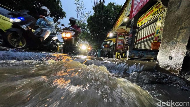 Jakarta - Hujan deras yang turun membuat Jalan Pagelarang, Jakarta Timur, tergenang. Begini genangan yang terjadi pada jalan penghubung Jakarta-Bekasi itu.