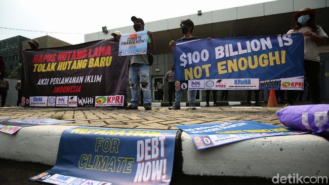 Jakarta - Sejumlah orang berdemo di Kedubes Inggris di Jakarta. Mereka meminta negara G20 membayar kompensasi terkait perubahan iklim pada negara-negara berkembang.