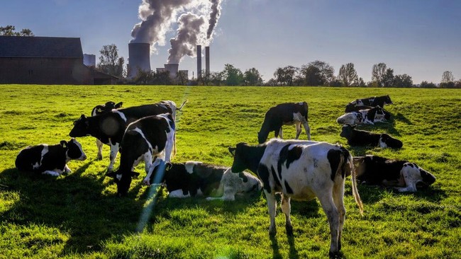 Sapi berkumpul di dekat pembangkit listrik tenaga batu bara di Niederaussem, Jerman. AP Photo/Michael Probst