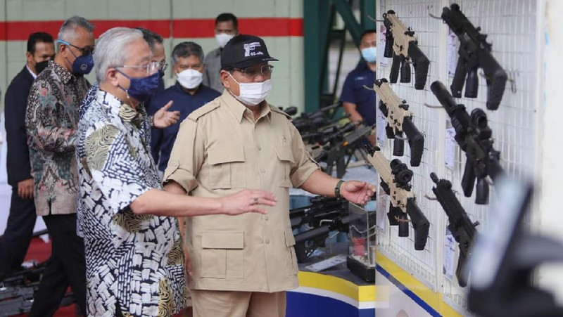 Prabwo memperlihatkan industri pertahanan milik PT Pindad ke PM Malaysia. PT Pindad memamerkan jenis senjata mulai dari pistol Armo berbagai varian, G2 series, Mag 4, P3A, SPR berbagai varian, SS2 V5 A1, Blackout, Dopper dan SPM. (Foto. Tim Dokumentasi Menhan Prabowo)