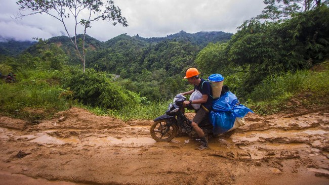 Warga menaiki sepeda motor melintasi jalan desa yang rusak pascabencana tanah longsor di Desa Datar Ajab, Kabupaten Hulu Sungai Tengah, Kalimantan Selatan, Jumat (12/11/2021).