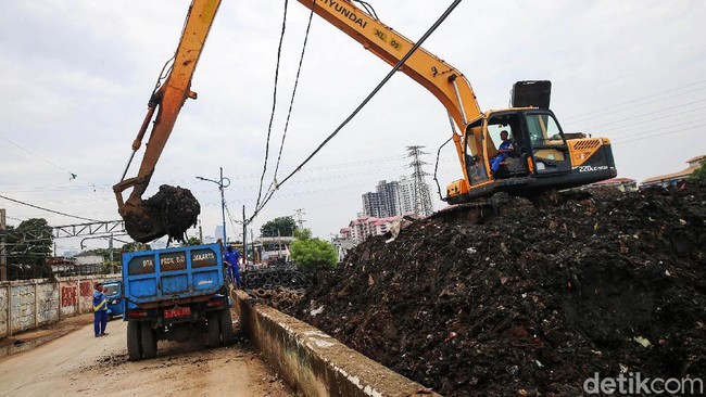 Jakarta - Dinas Sumber Daya Air Provinsi DKI Jakarta membersihkan lumpur yang mengendap di Kanal Banjir Barat. Lumpur yang telah diangkat kemudian dibuang.