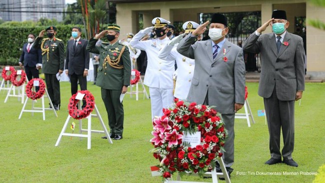Jakarta - Menteri Pertahanan (Menhan) Prabowo Subianto mewakili pemerintah Indonesia menghadiri Remembrance Sunday di TPU Menteng Pulo.