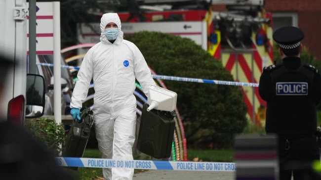 Polisi dan petugas forensik hadir di Rumah Sakit Wanita Liverpool pada 15 November 2021 di Liverpool, Inggris. Seorang pria tewas ketika taksi yang ditumpanginya meledak di luar Rumah Sakit Wanita Liverpool tepat sebelum pukul 11:00 kemarin. Pengemudi taksi terluka.