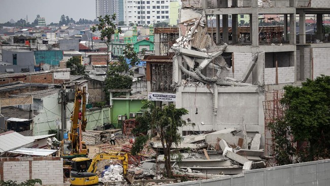 Jakarta - Proyek gedung SMAN 96 Jakarta roboh. Kini, lokasi proyek tersebut dipasangi garis polisi.