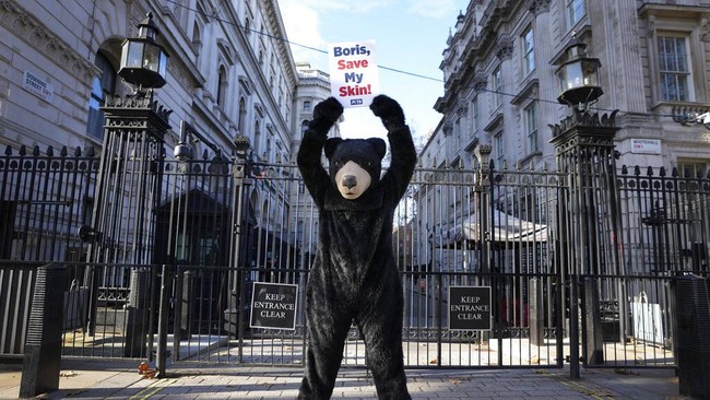 London - Seorang demonstran mengenakan kostum beruang saat melakukan aksi di kawasan Downing Street, London. Aksi itu digelar untuk kampanyekan penggunaan bulu palsu.