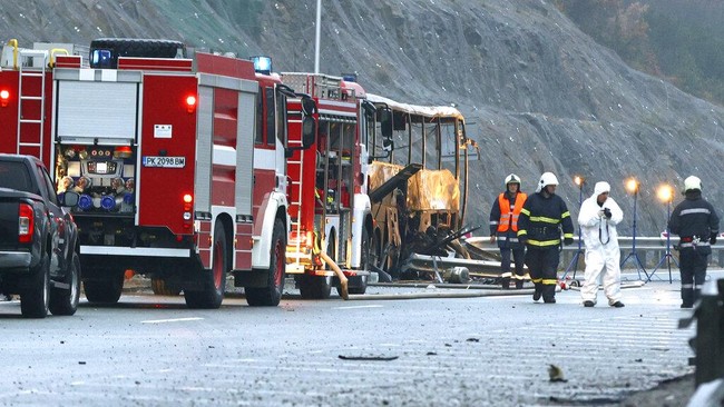 Bulgaria - Kecelakaan maut bus terjadi di jalan tol di Bulgaria. Sebuah bus yang membawa turis itu terbakar di jalan tol, Selasa, dini hari waktu setempat.