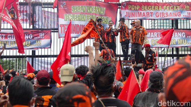 Jakarta - Massa Pemuda Pancasila (PP) berunjuk rasa di depan Gedung DPR menuntut Junimart Girsang minta maaf. Mereka mengenakan seragam PP, loreng oranye.