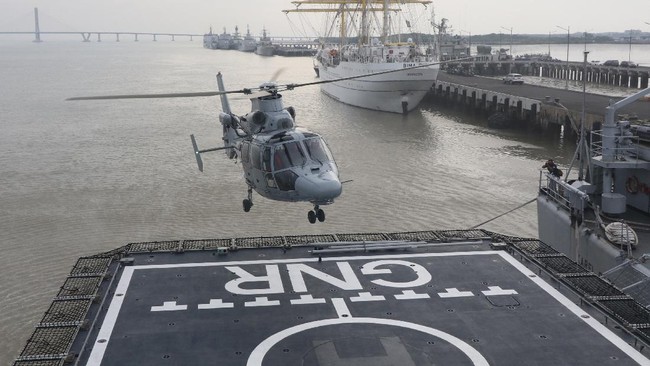 Helikopter militer Eurocopter AS565 Panther skadron udara 400/anti kapal selam TNI Angkatan Laut mendarat di atas kapal KRI I Gusti Ngurah Rai.