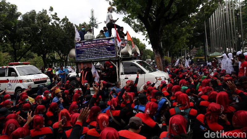 Para buruh menuntut ada kenaikan UMP 2022 sampai 10 persen. Buruh juga berharap Anies tak jadi pimpinan yang penakut. (Foto: Agung Pambudhy)