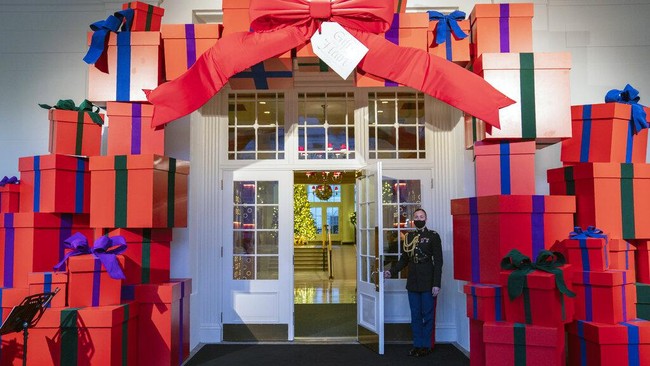 Amerika Serikat - Gedung Putih resmi menampilkan dekorasi untuk menyambut Hari Natal. Bertema 'Persembahan dari Hati' dekorasi ini juga didedikasikan untuk garda terdepan COVID.