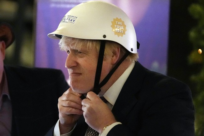 PM Boris Johnson mengenakan helm sebelum bersepeda ke pasar malam menyambut Natal yang tidak jauh dari kantornya di Jl Downing Street No.10, London, Inggris (30/11/2021).