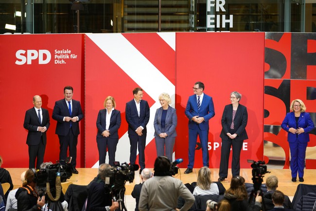 Berlin - Kanselir baru Jerman, Olaf Scholz bersama calon menteri memberi keterangan pers. Ia ditunjuk partainya, menjadi kanselir yang akan diambil sumpah, Rabu (8/12).