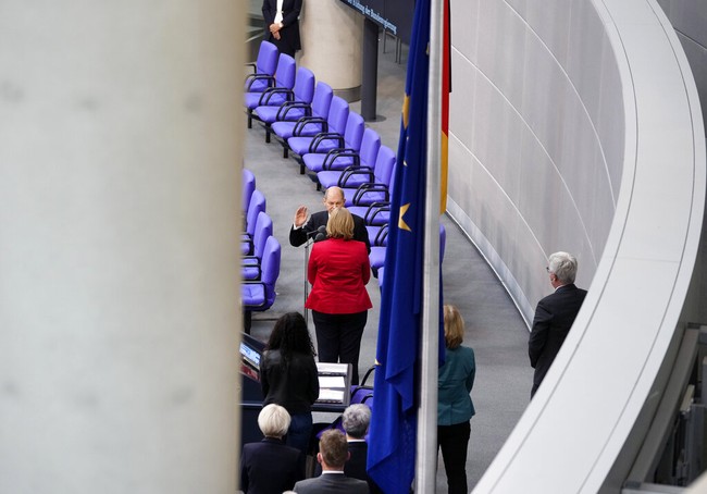 Olaf Scholz membacakan sumpah jabatan di depan Ketua Parlemen Jerman, Baerbel Bas dan seluruh anggota parlemen, (8/12/2021). Scholz menjadi kanselir Jerman ke-9 pasca Perang Dunia II.