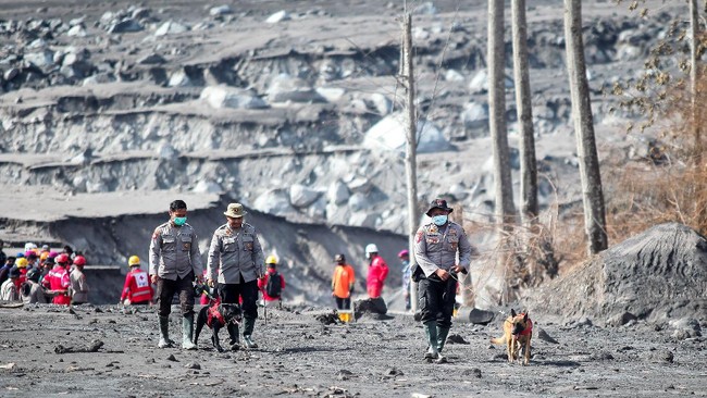 Lumajang - Anjing pelacak dikerahkan untuk membantu pencarian korban tertimbun material letusan gunung Semeru. Pencarian korban difokuskan di sejumlah titik.