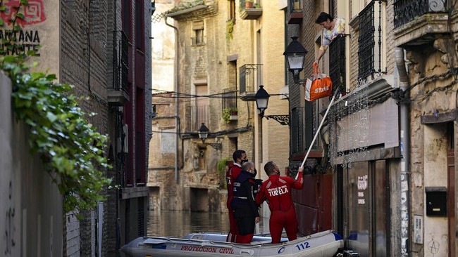Tudela - Banjir merendam kawasan Tudela, Spanyol utara, usai diguyur hujan lebat yang menyebabkan Sungai Ebro meluap. Petugas penyelamat bahu membahu mengevakuasi warga.