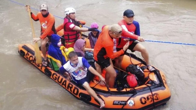 Dalam foto yang dibagikan oleh Penjaga Pantai Filipina ini, warga menaiki perahu karet di sepanjang banjir yang disebabkan oleh Topan Rai saat mereka dievakuasi ke tempat yang lebih tinggi di Cagayan de Oro City, Filipina selatan pada Kamis, 16 Desember 2021.