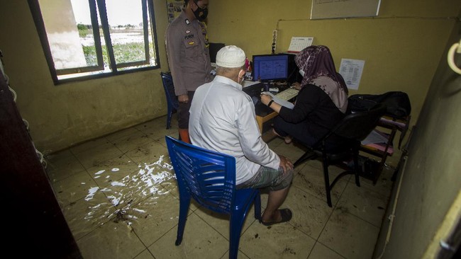 Kabupaten Banjar - Banjir merendam Kabupaten Banjar, Kalimantan Selatan. Meski banjir pelayan di Mapolsek Martapura dan proses vaksinasi tetap berjalan.
