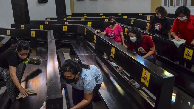 Warga membersihkan tempat peribadatan umat Kristiani di Gereja Katolik Santo Yohanes, Kabupaten Ciamis, Jawa Barat, Selasa (21/12/2021).