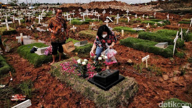 Jakarta - Umat Nasrani melakukan ziarah makam keluarganya di tempat pemakaman khusus COVID-19, Rorotan, Jakarta. Suasana haru menyelimuti ziarah makam tersebut.