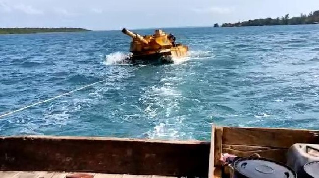 Benda yang disebut sebagai kendaraan tempur itu dibawa ke posmat Kijang dengan cara ditarik menggunakan pompong kayu nelayan.