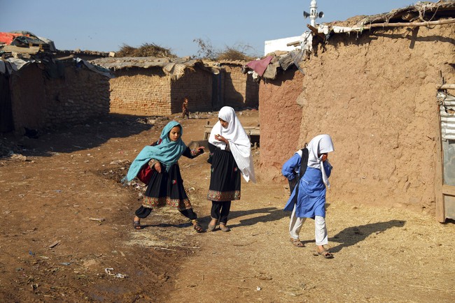 Islamabad - Anak-anak pengungsi Afghanistan belajar di pinggiran Islamabad, Pakistan, (29/12). Mereka terpaksa mengungsi pasca Taliban berkuasa, pertengahan Agustus lalu.