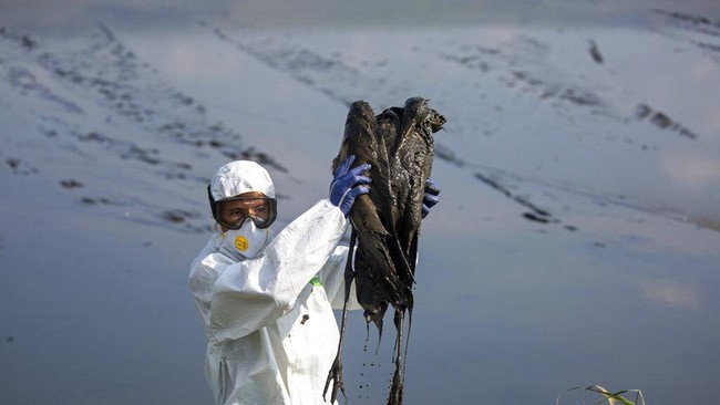 Seorang pekerja mengambil burung bangau yang mati di kawasan konservasi Danau Hula, utara Laut Galilea, di Israel utara, Minggu, (2/1/2022).