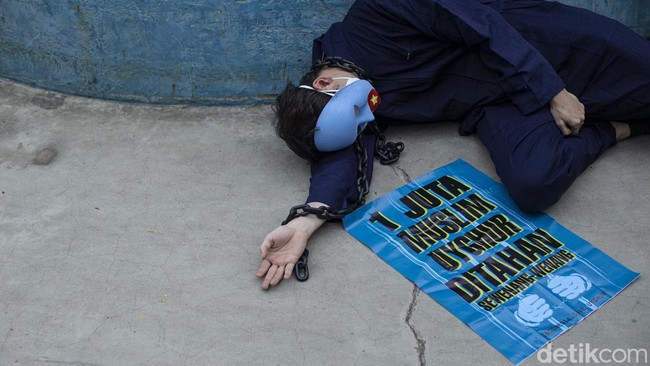 Jakarta - Kelompok Indonesia Save Uighur melakukan aksi teatrikal di Jakarta, Selasa (4/1/2022). Aksi ini sebagai bentuk solidaritas atas kondisi muslim Uighur, China.