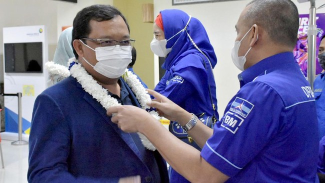 Kepala Badan Pembina Organisasi, Kaderisasi, dan Keanggotaan (BPOKK), Herman Khaeron yang di dampingi Kepala Badan Komunikasi Strategis DPP Partai Demokrat, Herzaky Mahendra Putra disambut meriah oleh DPD Aceh di bandara.