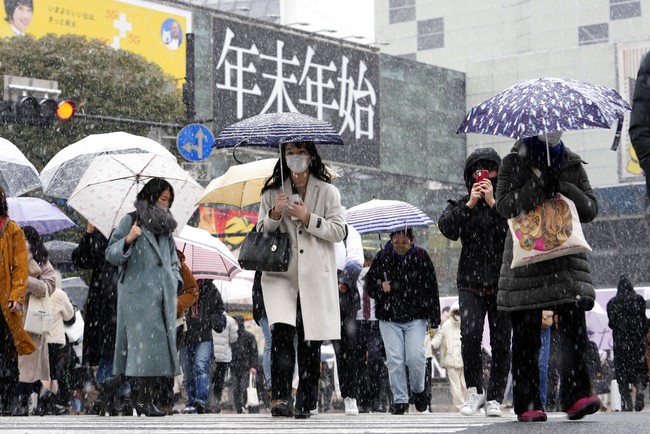 Tokyo - Warga menembus hujan salju yang turun di Tokyo, Jepang. Kota di bibir teluk itu pun memutih berlapis salju. Suhu menunjukkan 4 derajat Celcius. Dingin.