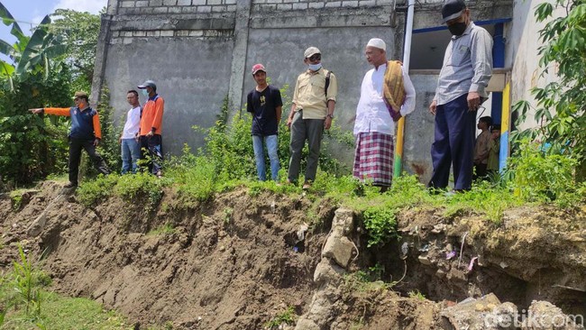 Lamongan - Bibir Bengawan Solo yang ada di Desa Keduyung, Kecamatan Laren, Lamongan, ambles sepanjang 50 meter. Akibatnya sekolah dan rumah warga terancam ambruk.