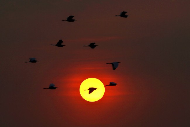 India - Kumpulan burung terbang saat matahari tenggelam. Hewan yang terbiasa hidup berkelompok tersebut kembali ke sarang setelah seharian berkelana dan mencari makan.