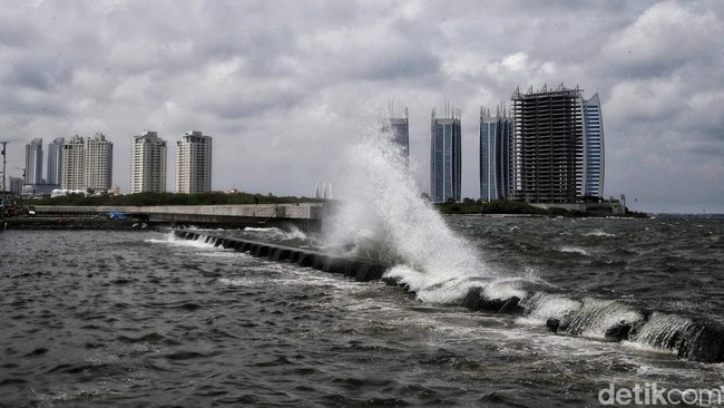 Jakarta - Pekerja terus menyelesaikan pembangunan tanggul laut sepanjang 12,6 km dari target prioritas sepanjang 46 km. Terkendala air pasang yang cukup tinggi.