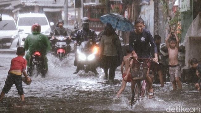 Jakarta - Hujan deras membuat jalanan di Pademangan Timur, Jakarta Utara, tergenang. Anak-anak sekitar memanfaatkan momen tersebut dengan bermain di genangan.