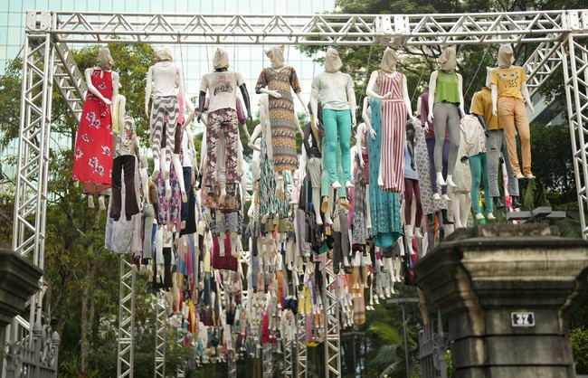 Sao Paulo - Sebanyak 365 manekin digantung di pelataran gedung di Sao Paulo, Brazil. Karya instalasi seniman tersebut untuk memperingati korban Covid-19.