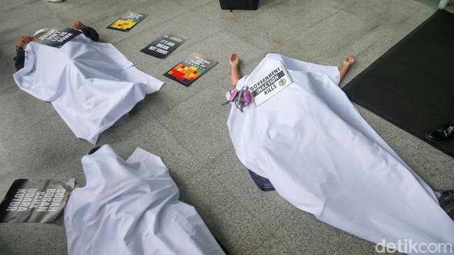 Begini penampakan para korban imbas polusi udara yang tertutup kain putih di halaman PN Jakarta Pusat.