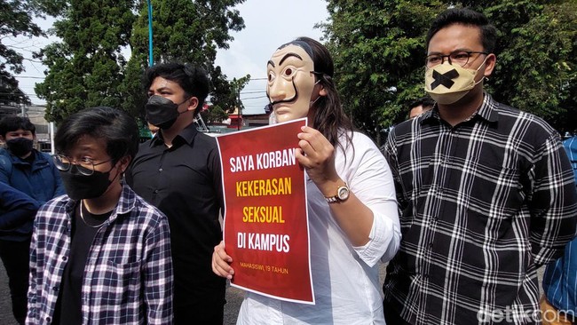 Bandung - Mendikbud Ristek Nadiem Makarim diselonjorkan aksi penolakan kekerasan seksual di perguruan tinggi saat berkunjung ke Unpad.