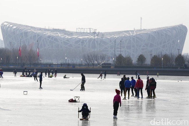 Beijing - Warga bermain ski es di taman kota yang membeku, di Beijing, China, (18/1). Musim dingin membuat negara bumi utara membeku dan kehilangan hangatnya matahari.