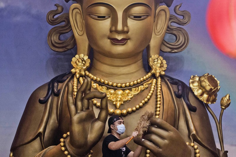 Pekerja membersihkan patung Budha di Vihara Satya Budha, Medan (19/1/2022). Kegiatan rutin tersebut bertepatan dengan persiapan menyambut Imlek 2573 Kongzili pada 1 Februari mendatang.