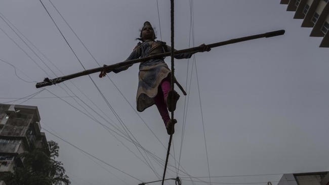 India - Seorang gadis India berjalan di atas tambang untuk mencari uang. Begini aksinya.