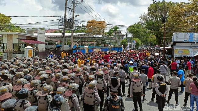 Ratusan massa aksi berhadap-hadapan dengan polisi. Massa memprotes karena oknum polisi Bripka Bayu Tamtomo pemerkosa mahasiswi inisial DV hanya divonis 2,6 tahun bui.